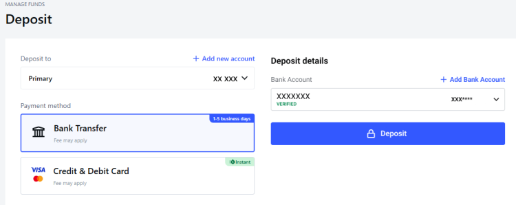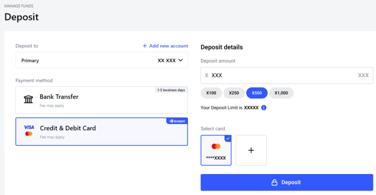 For debit/credit cards, enter your deposit amount, select your card, or add a new one, and complete the process with a confirmation.