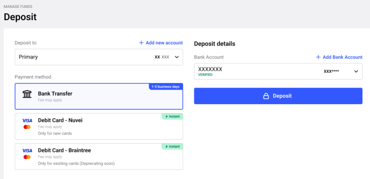 如想使用已添加的银行卡进行入金,请点击 Credit & Debit Card - Braintree(信用卡与借记卡 - Braintree),然后选择您的银行卡。如想添加新卡,请点击 Credit & Debit Card - Nuvei(信用卡与借记卡 - Nuvei)。