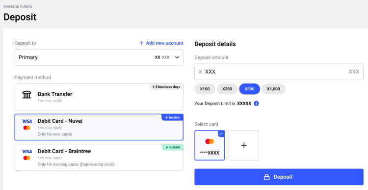 请注意屏幕上的Deposit Limit(存款限额)信息。您的存款限额取决于您在注册时或最近PIU(个人信息更新)期间向我们提供的金融信息等因素。存款限额表示您所有账户的最大净额。