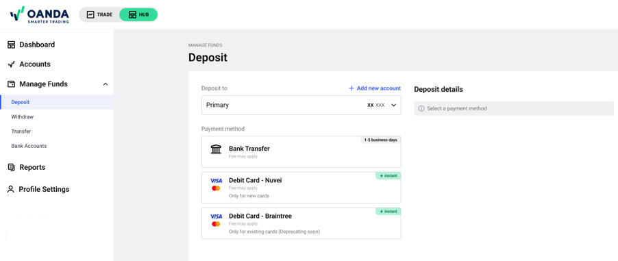 您将看到 Using the HUB(使用HUB)专区中说明的相同入金方法。按照提示完成该过程。