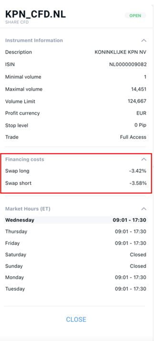 然而,由于该仓位在东部时间周三下午5点以后仍未平仓,因此周末融资将适用。总计收到3天的贷记费用,即5.70 x 3 = 17.10欧元。账户将收到17.10欧元(折算为您的账户本币)的融资贷记费用。