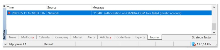 如果您输入了不正确的登录名、密码或服务器,MT5平台将在Toolbox(工具箱)下的Journal(日志)选项卡中显示Invalid account(无效账户)错误消息。