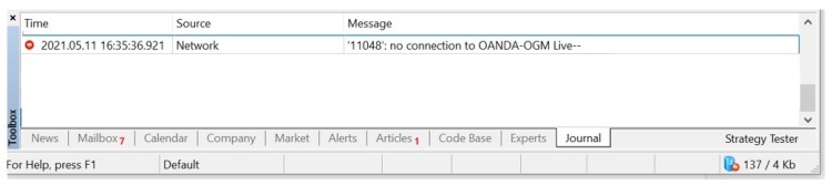 如果您输入的服务器不正确或您的平台服务器列表需要刷新,MT5平台将在Toolbox(工具箱)下的Journal(日志)选项卡中显示no connection(无连接)错误消息。