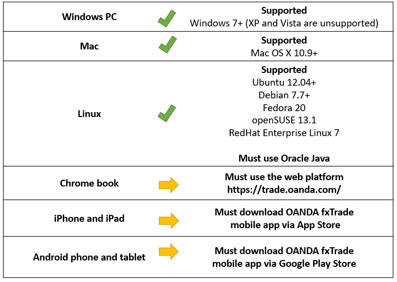 请参阅以下图表以了解系统与OANDA Desktop Trading的兼容性。