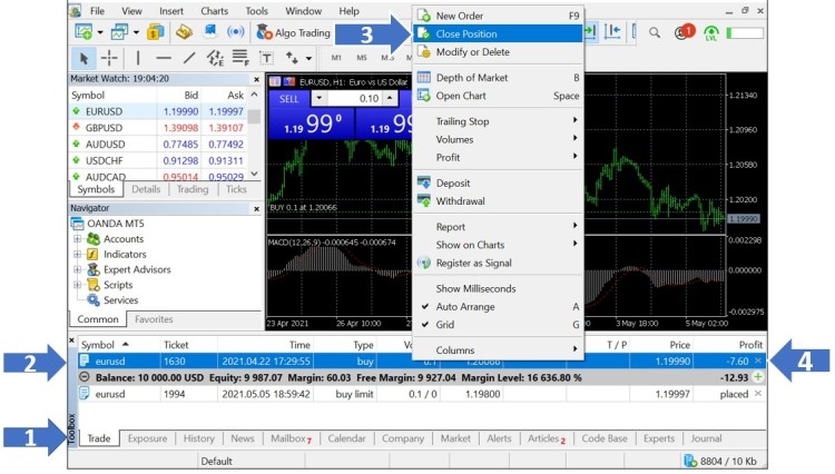 本用户指南将详细说明如何通过 MT5 应用程序,用 OANDA One 子账户进行交易关闭 买卖资产的实际执行过程,并最终完成交易。。如需了解更多信息,请参阅 MetaQuotes Software Corp 发布的官方 MT5 用户指南