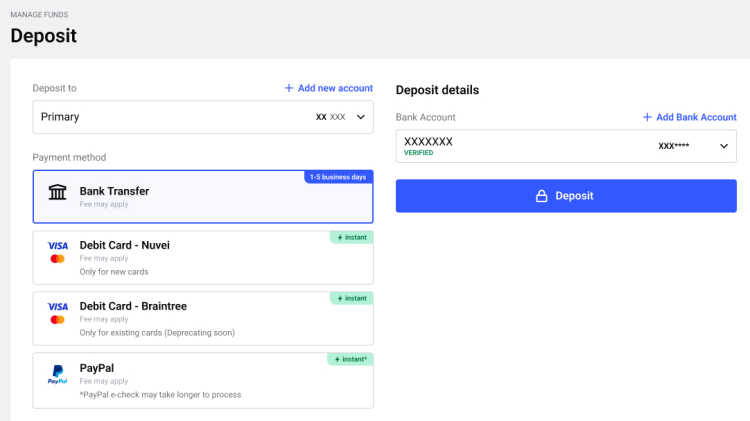 For debit/credit cards, enter your deposit amount, select your card, or add a new one, and complete the process with a confirmation.
