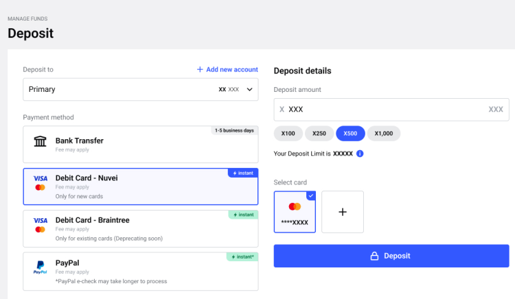 If you want to deposit with your already added card, click on Credit & Debit Card - Braintree and select your card. If you want to add a new card, click on Credit & Debit Card - Nuvei.