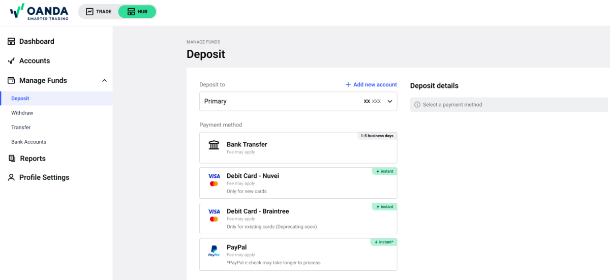 You will notice the same deposit methods as explained in the Using the HUB section. Follow the prompts to complete the process.