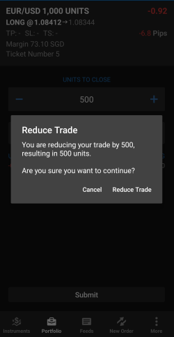 Si vous souhaitez clôturer partiellement une transaction, cliquez sur Reduce (Réduire). Si vous cliquez sur Reduce (Réduire), vous devez saisir le nombre d'unités ou le pourcentage de transaction que vous souhaitez réduire. La saisie d'une valeur entraîne automatiquement le calcul de l'autre. Envoyez et cliquez sur Reduce Trade (Réduire transaction) pour confirmer votre intention.