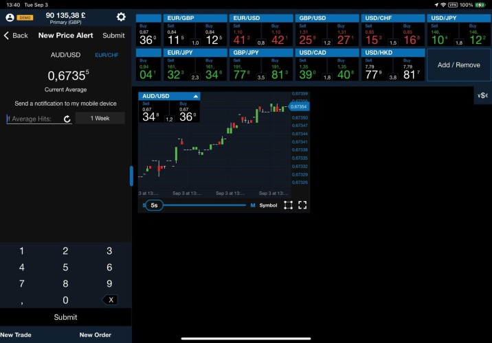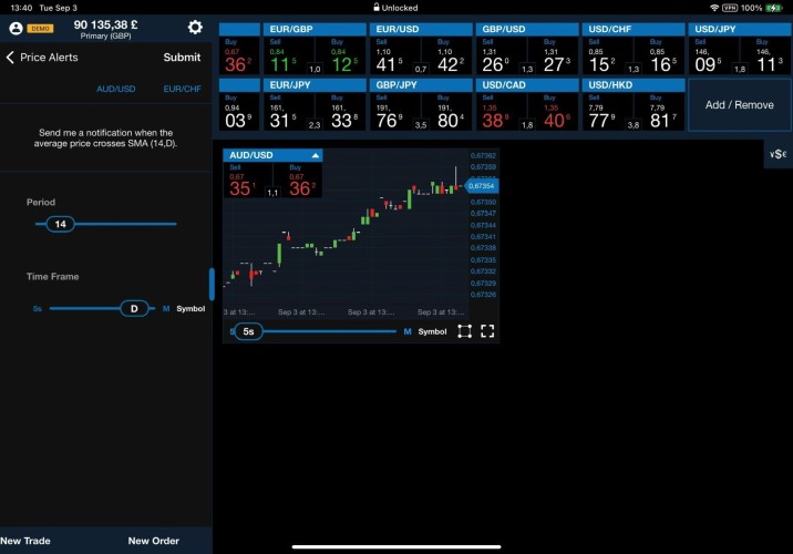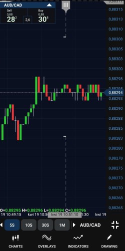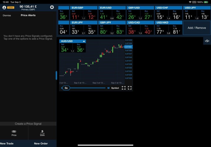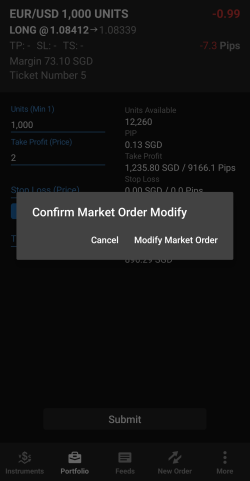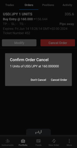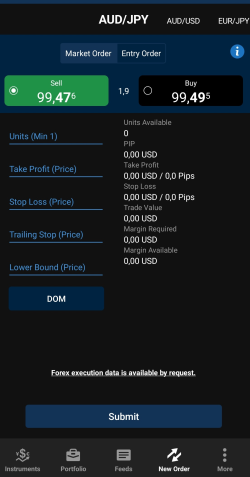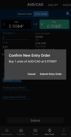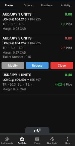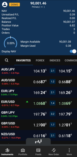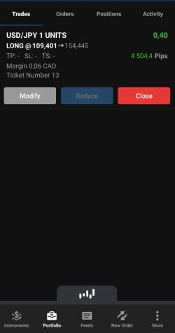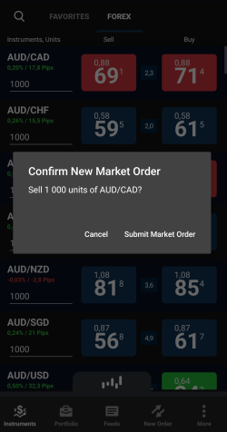 Dans la barre inférieure, cliquez sur Instruments. Faites défiler jusqu'à la paire de devises que vous souhaitez négocier, puis appuyez et maintenez le côté Sell (Vendre) ou Buy (Acheter) du taux. Un cercle orange apparaît à l'endroit où vous maintenez le taux.