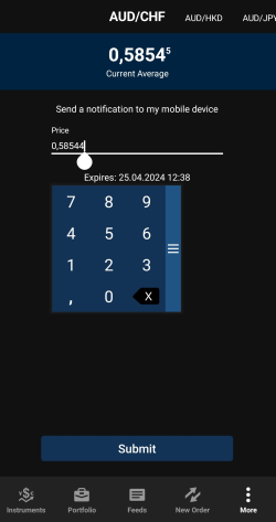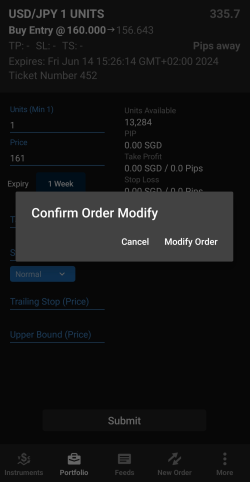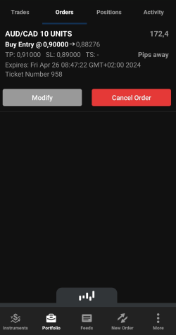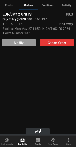 Une instruction d'achat ou de vente d'un instrument lorsque son prix atteint un niveau prédéterminé., saisissez également le cours auquel l'ordre doit être déclenché et l'heure à laquelle l'ordre doit expirer.L'option Expiry (Échéance) est fixée par défaut à 1 semaine. Vous pouvez la modifier en cliquant dessus. Vous pouvez choisir entre les heures, les jours ou les mois. Par exemple, si vous réglez l'option sur 1 Day (1 jour), elle expirera 24 heures après l'heure à laquelle l'ordre a été passé, et non à la fin de la journée ou de la session de marché en cours. Cela signifie qu'un ordre passé le 28 novembre 2023 à 11h30 expirera le 29 novembre 2023 à 11h30. La même logique s'applique aux autres plages de temps. -