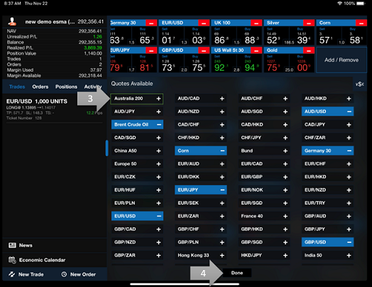 Appuyez sur le nom de l'instrument pour ajouter le CFD à votre panneau des Rates (Taux).