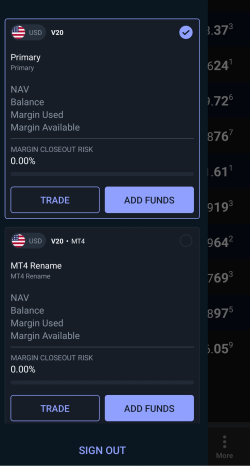 Cliquez sur le symbole du compte et de la devise affiché dans la barre d'outils supérieure. La barre d'outils se développe pour afficher les éléments suivants :