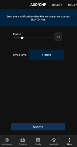 Si vous avez sélectionné Price (Prix), saisissez le niveau de prix moyen souhaité pour le déclenchement de l'alerte prix. Le prix moyen est le prix intermédiaire entre le cours acheteur et le cours vendeur où les ordres sont exécutés. Si vous avez sélectionné SMA, choisissez la période et l'horizon temporel souhaités pour SMA.
