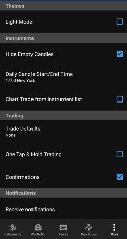Vous pouvez choisir la fourchette de prix à utiliser pour les bougies quotidiennes via More (Plus) > Settings (Paramètres) > Daily Candle Start/End Time (Heure de début/fin quotidienne des bougies). Le réglage par défaut est 17 heures ET