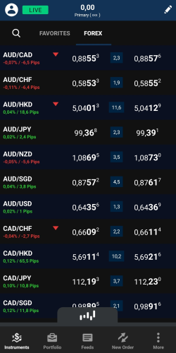 Dans la barre inférieure, assurez-vous d'avoir sélectionné Instruments. Vous pouvez voir tous les instruments avec lesquels vous pouvez négocier. Appuyez sur les différents onglets de catégories ou sur l'onglet Favourites (Favoris) pour trouver les instruments appropriés. Vous pouvez également utiliser l'icône de la loupe pour rechercher un instrument spécifique en entrant le texte exact.