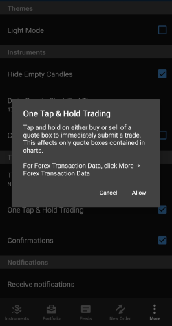 Cochez la case à côté de l'option One Tap & Hold Trading (Trading par appui prolongé) et cliquez sur Allow (Autoriser).