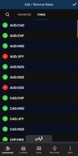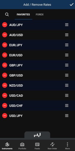 Pour ajouter une paire de devises à votre onglet Favorites (Favoris), cliquez sur le signe green plus (plus vert) situé à côté de la paire de devises souhaitée. La paire sera ajoutée et le signe green plus (plus vert) se transformera en signe red minus (moins rouge). Une fois que vous avez terminé, cliquez sur l'icône tick (coche) dans le coin supérieur droit.