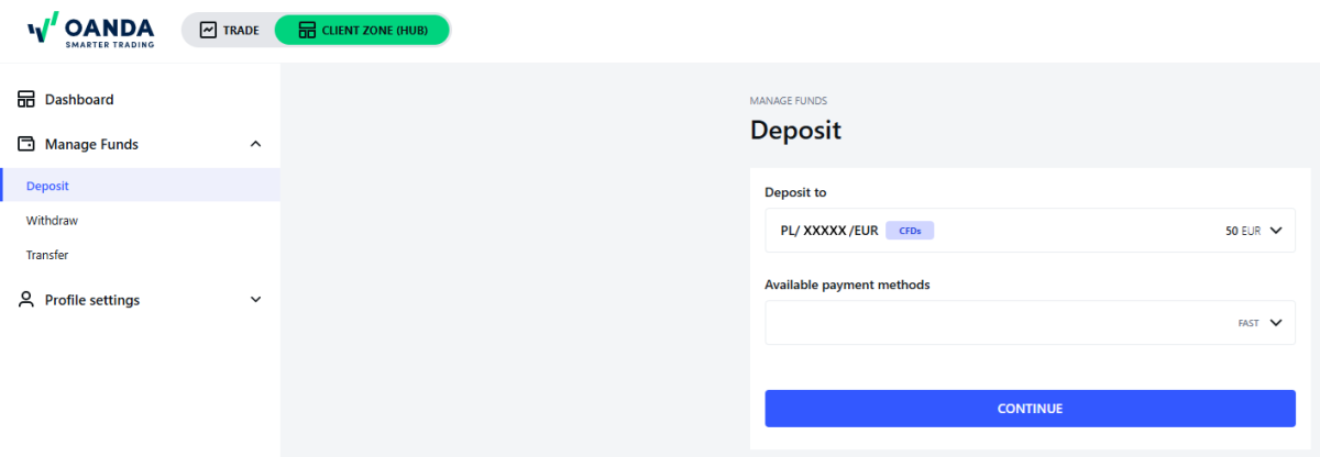 Select the payment method and enter the deposit amount. Next, tap on CONTINUE.