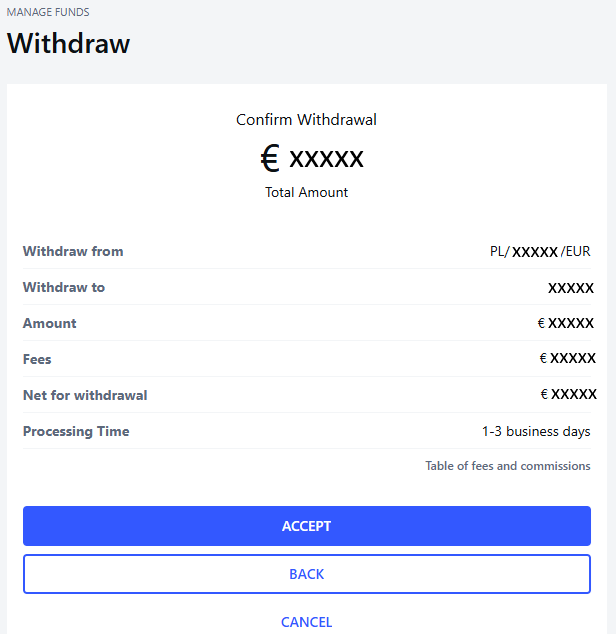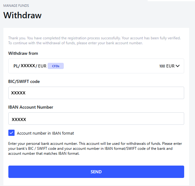 If you have not previously added your bank account number, enter your BIC/SWIFT code and your account number in the IBAN format for withdrawing your funds by bank transfer. Then, confirm it with a confirmation SMS code. For Polish clients who want to withdraw in PLN, we only need the account number.