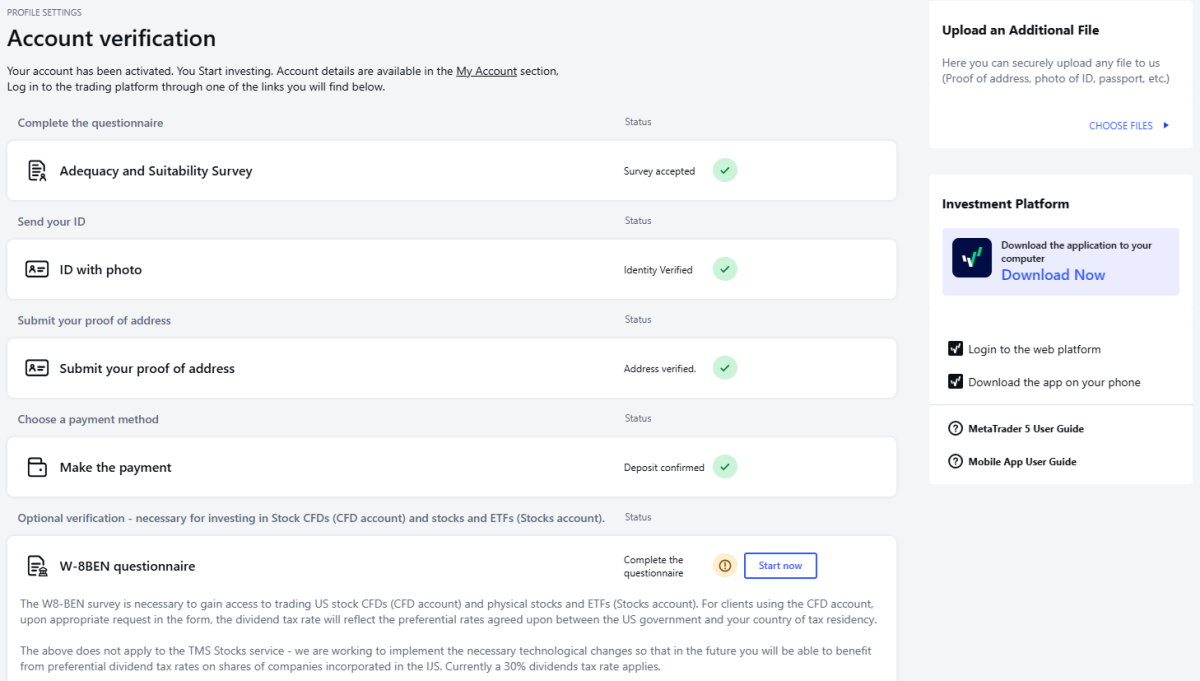 Wypełnić kwestionariusz adekwatności i odpowiedniości oraz kwestionariusz W-8BEN (wymagany do handlu kontraktami CFD na akcje oraz akcjami fizycznymi i funduszami ETF)