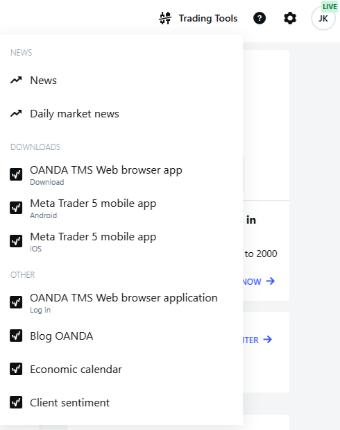 Przy użyciu opcji Trading Tools (Narzędzia do handlu): uzyskać dostęp do wiadomości rynkowych, naszego bloga, kalendarza ekonomicznego i sentymentu klientów, pobrać platformy inwestycyjne oraz zalogować się do platformy webowej MT5