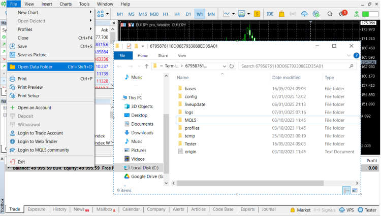 Zamknij folder z danymi i zrestartuj platformę MT5.