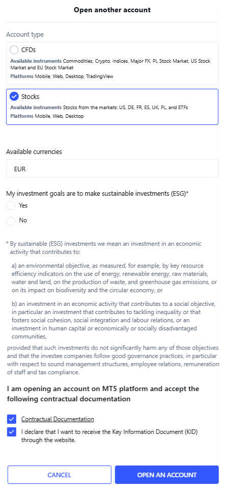 Wybierz Stocks (Akcje) z poziomu Account type (Typ konta) i Currency (Walutę) (PLN, USD, EUR) nowego subkonta. Wypełnij kwestionariusz dotyczący celów inwestycyjnych oraz przeczytaj i zaakceptuj dokumentację.