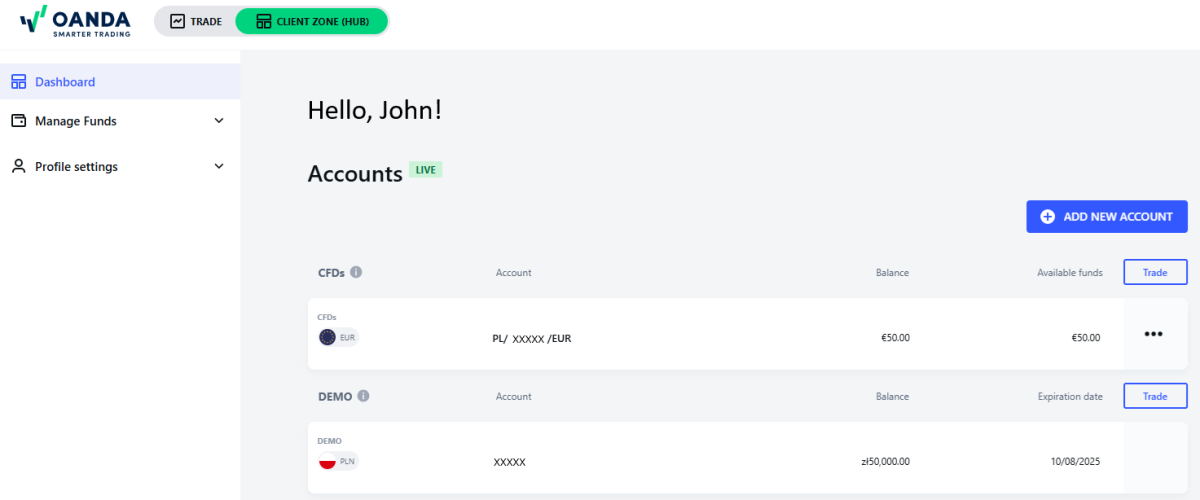 W lewym panelu nawigacji przejdź do sekcji Dashboard (Pulpit nawigacyjny), a następnie kliknij ADD NEW ACCOUNT (Dodaj nowe konto).