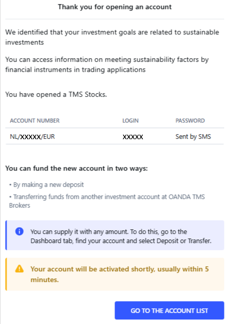 Po wykonaniu powyższych kroków będziesz mieć dostęp do wszystkich akcji oferowanych przez OANDA TMS w ramach konta Stocks (Akcje) oraz funduszy ETF. Aby rozpocząć handel, możesz przelać środki z konta CFD, o ile waluta konta jest taka sama jak na koncie Stocks (Akcje). Możesz również zasilić swoje konto Stocks (Akcje), korzystając z dostępnych metod wpłat, takich jak przelew bankowy.