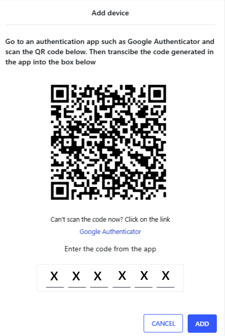 Zeskanuj kod QR używając Google Authenticator, wprowadź kod i kliknij ADD (DODAJ).