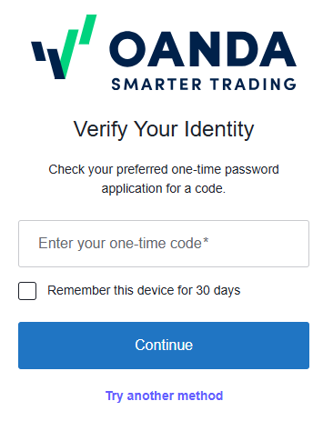 Portal HUB, aplikacja mobilna OANDA oraz TradingView: uwierzytelnianiem dwuskładnikowym dla tych platform zarządza się bezpośrednio w portalu HUB. Po włączeniu tej funkcji konieczne będzie potwierdzanie tożsamości przy każdym logowaniu (chyba że zaznaczysz opcję Remember this device for 30 days (Pamiętaj to urządzenie przez 30 dni)), zarówno do portalu HUB, aplikacji mobilnej OANDA, jak i TradingView, co zapewnia bezpieczeństwo danych Twojego konta oraz aktywności handlowej.