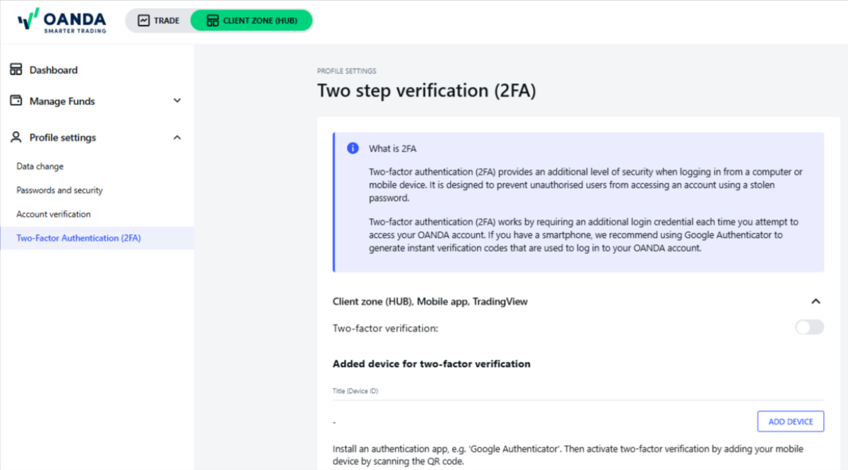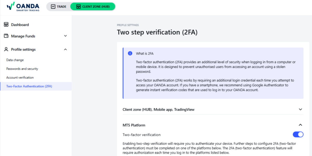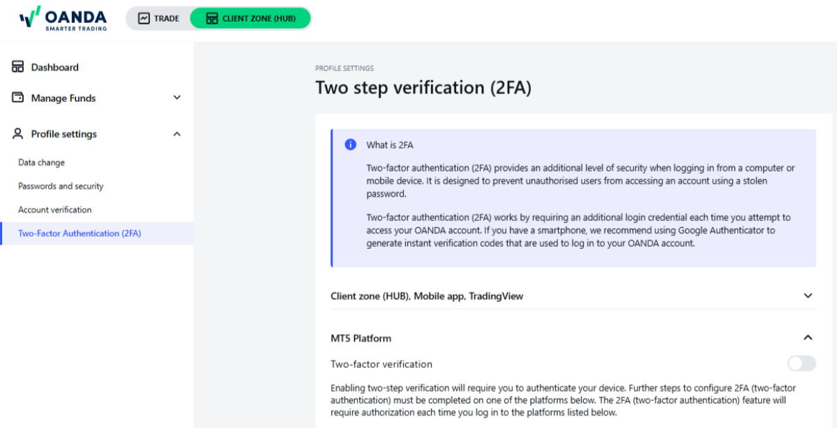 Uwierzytelnianie dwuskładnikowe (2FA) dodaje kolejny poziom bezpieczeństwa przy logowaniu do portalu HUB, aplikacji mobilnej OANDA, TradingView lub MetaTrader 5 (MT5) z komputera lub urządzenia mobilnego. Jego celem jest ochrona konta przed nieautoryzowanym dostępem, nawet w przypadku kradzieży hasła.