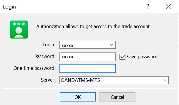 Na ekranie logowania wprowadź swój login, hasło i hasło jednorazowe z aplikacji Google Authenticator lub aplikacji mobilnej MT5. Następnie kliknij OK.