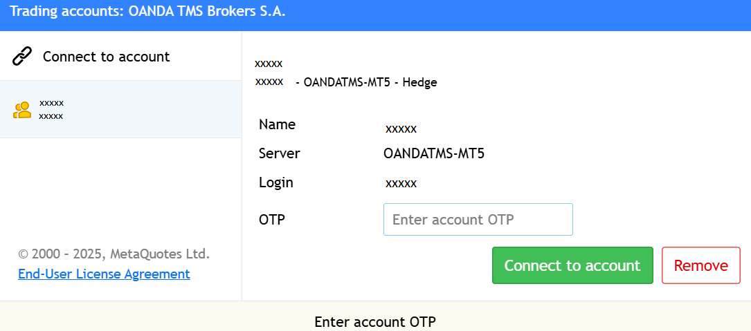Wpisz hasło jednorazowe z aplikacji Google Authenticator lub aplikacji mobilnej MT5. Następnie kliknij Connect to Account (Połącz z kontem).