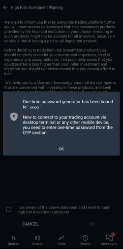 Jeśli Twoje subkonto handlowe MT5 zostanie pomyślnie powiązane z generatorem haseł jednorazowych, zostanie wyświetlone okno z komunikatem o pomyślnym zakończeniu operacji. Dotknij OK.