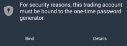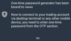 If your MT5 trading sub-account is successfully bound to the OTP generator, a success message window appears. Tap on OK.