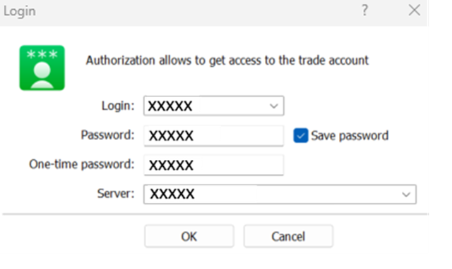 On the login window, enter your login, password and the one-time password from Google Authenticator or the MT5 mobile app. Then, click on OK.