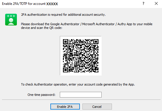 A new window appears. Scan the QR code using Google Authenticator. Then, enter the one-time password from Google Authenticator and click on Enable 2FA.