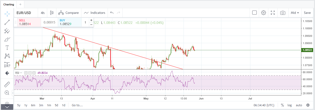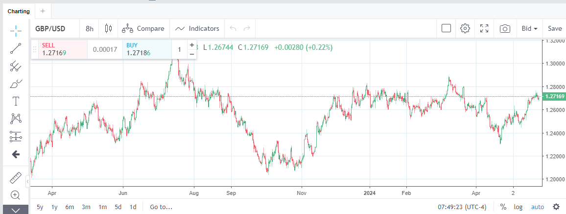 The first rate displayed is the bid (sell) rate. The second rate is the ask (buy) rate. Most currency pair rates use five decimal places, with the fourth decimal place acting as the ‘pip’ and the fifth decimal place acting as the ‘pipette’. Some pairs use three decimal places (for example those with a rate currency of JPY, THB, or HUF). In this case, the pip is the second decimal place and the pipette is the third decimal place. To help you see a daily change, there are pips changes displayed in green/red under each currency pair. When there’s movement in the exchange rate for a currency pair, the up/down (green/red) indicators show you the change direction. These indicators help you track the currency pairs you aren’t currently viewing on the graph.
