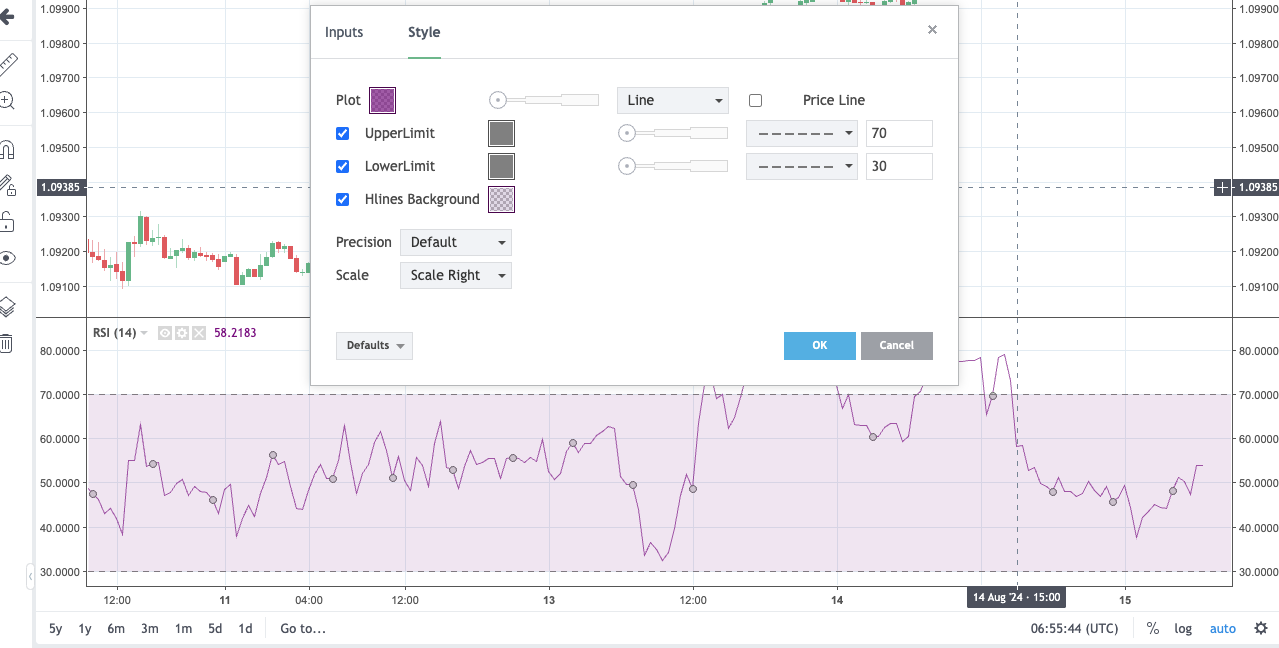 Select from Style, Scales, Background, Timezone/Sessions and Trading.