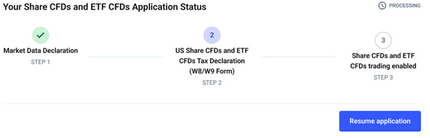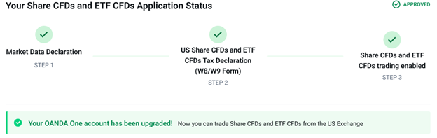 After we review the information, if your account is approved, the Share CFDs trading enabled - Step 3 will be marked as completed in HUB, as shown in the following image: